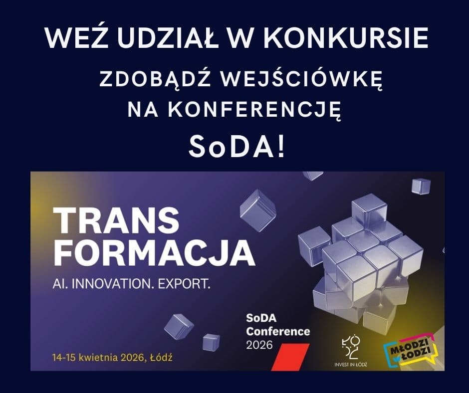 UWAGA studenci kierunków informatycznych! Mamy dla Was Super Konkurs, w którym możecie wygrać BEZPŁATNE WEJŚCIÓWKI na konferencję SoDA podczas której dowiecie się jak AI zmienia modele biznesowe, jak innowacje napędzają rozwój firm technologicznych i jak polski software skutecznie skaluje się globalnie.